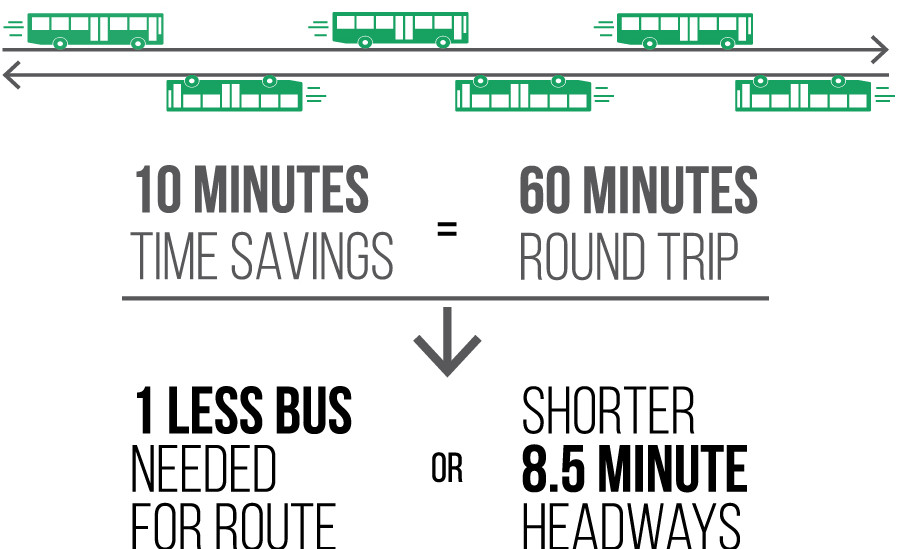 El tiempo que lleva a los pasajeros llegar a su destino es solo una parte de la ecuación. La eficiencia en el tiempo de operación de los vehículos de transporte público también es esencial. El diseño de calles puede impactar en la eficiencia de los vehículos de transporte público de múltiples maneras: