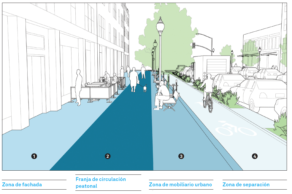 La zona de mobiliario urbano es esencial para proporcionar comodidades a los peatones. Aquí se encuentran elementos como bancas, puestos de periódicos, alumbrado, áreas para árboles y bicicleteros. Además, esta zona puede contener elementos de infraestructura verde, como jardines de lluvia, árboles o macetas, que mejoran la calidad del entorno urbano.