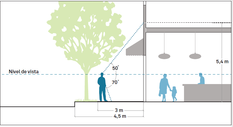 Las fachadas y los frentes de los establecimientos comerciales deben diseñarse teniendo en cuenta la altura de la vista del peatón, con énfasis en cómo cada edificación se vincula con la acera. La parte inferior de una edificación, que constituye la porción directamente visible y que el peatón experimenta de manera más intensa, debe ser especialmente considerada.