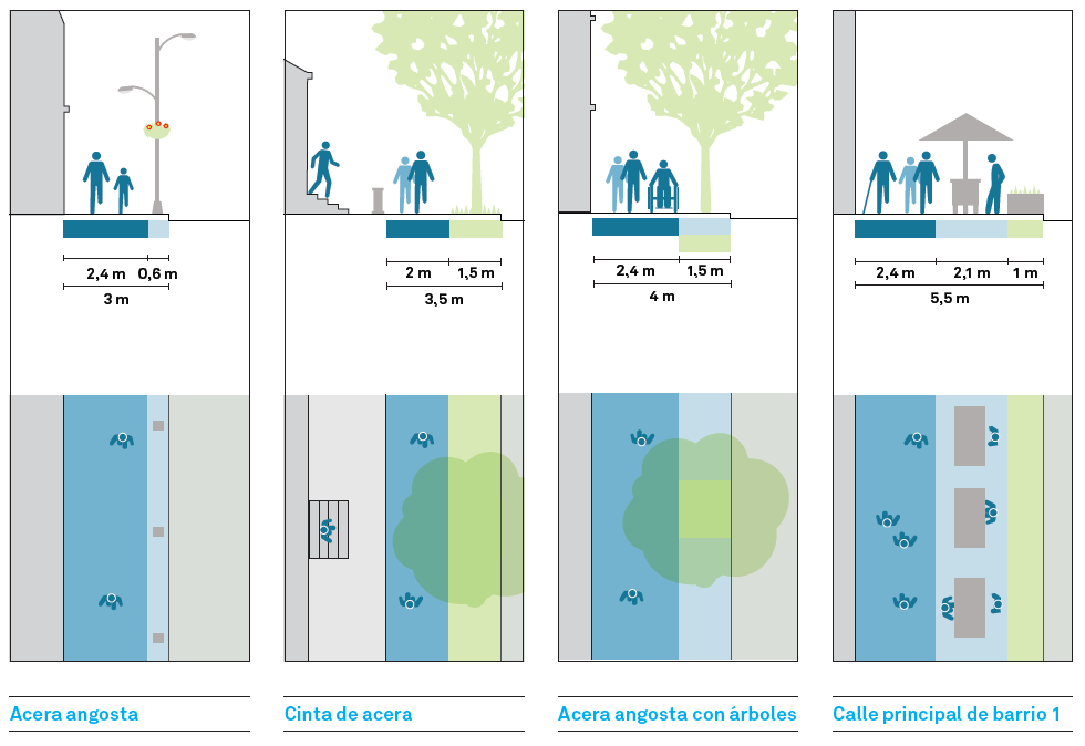 Para abordar la diversidad de contextos urbanos, es importante considerar diferentes tipos de aceras: