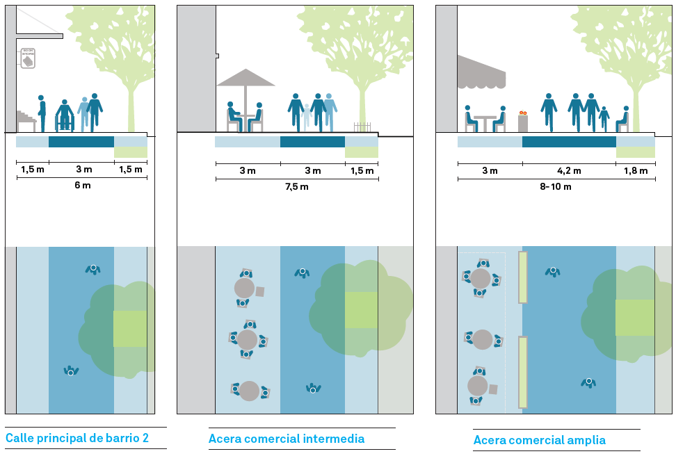 Los corredores comerciales con altos flujos de peatones y actividades deben diseñarse, en lo posible, con un ancho de 8-10 metros para ubicar la actividad comercial, el mobiliario urbano, paradas de transporte público y espacios de refugio peatonal o para hacer filas. Además, se debe considerar la jardinería y la infraestructura verde como parte integral del diseño.