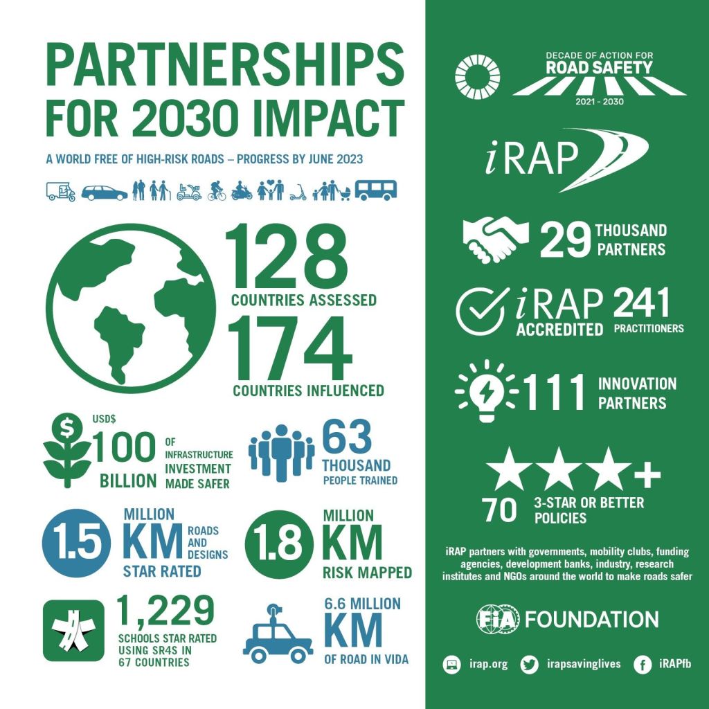 73.097 personas han sido formadas y 241 practicantes acreditados para entregar servicios de especificación iRAP al estándar global. 82 pólizas (estrategias y planes de acción globales y nacionales) ahora contienen métricas iRAP como indicadores clave de desempeño.