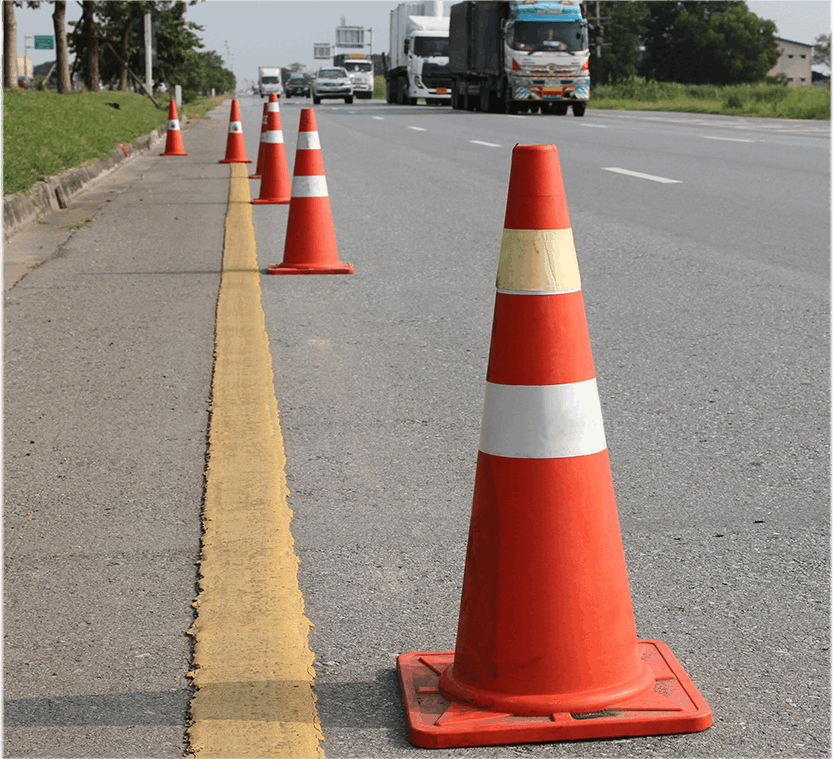 - Conos, canalizadores, barreras y vallas (con lastre; retroreflectancia vigente).